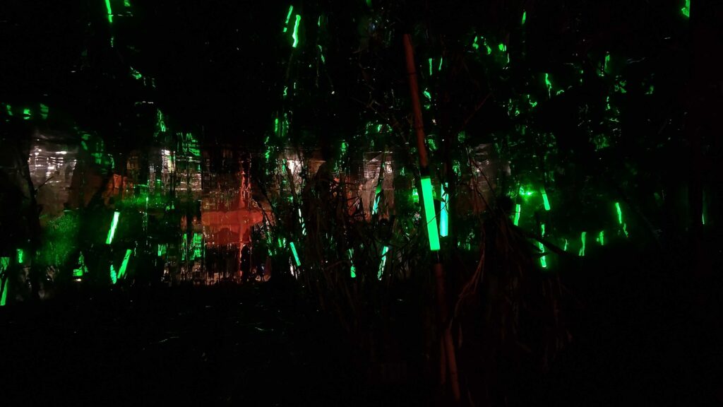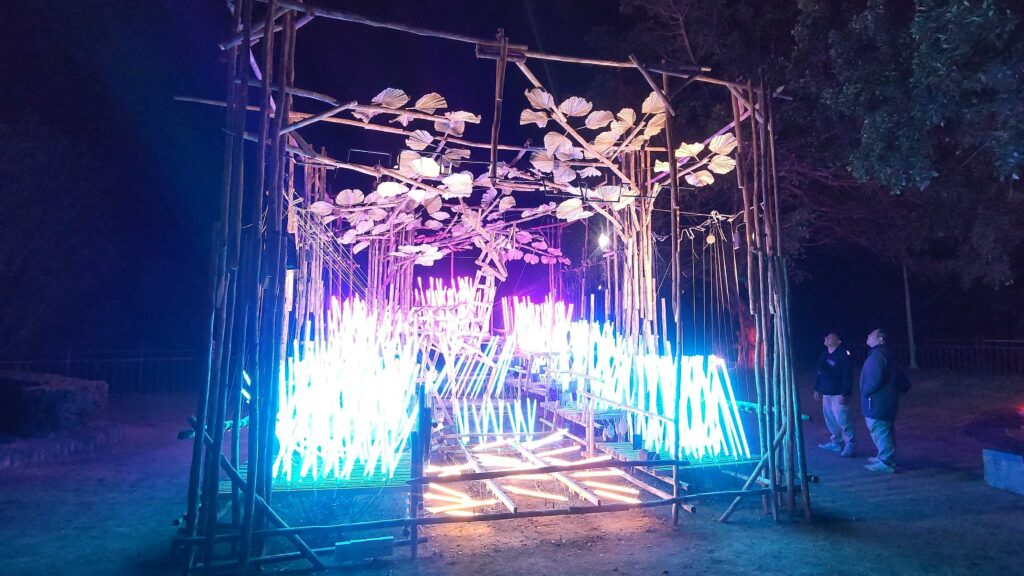 こちらは竹と光のアート。緑の部屋と進みそこで手を叩くと、緑の光が火花のように散ります。