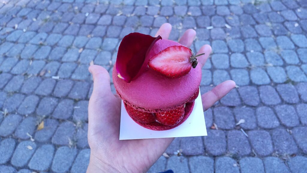 今年の甜點節は110店舗の出店が立ち並んでいたみたいなのですが、いろんな方がSNSでこのお店のマカロンを紹介してました!手のひらに乗るサイズのマカロンで中にはたくさんのいちごとライチが入ってました🍓