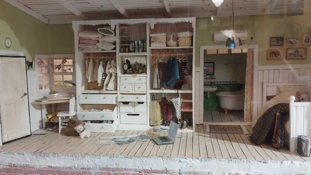 こちらの2つの作品は誰かが暮らすお家の中のようです。左側写真にはお洋服や部屋の中に飾られている写真も細かく作られています。左の作品は日本の映画『リトル・フォレスト』からインスピレーションを受けて作った作品だそうです。私はコタツを見つけて日本のお家だとわかりました😎