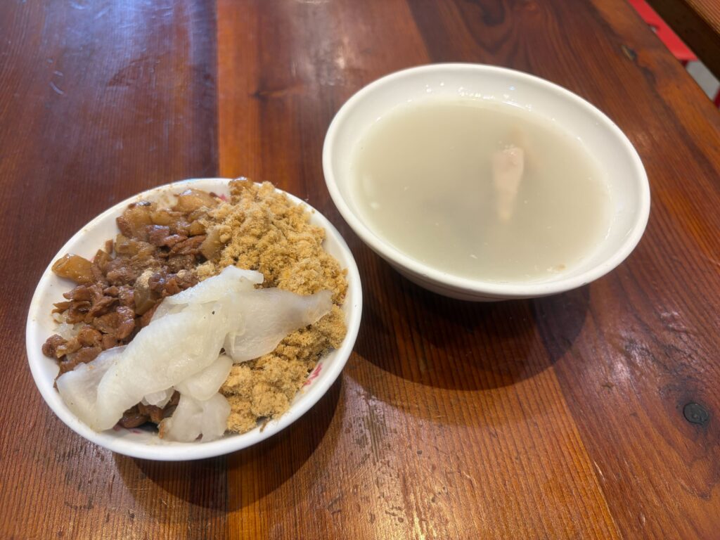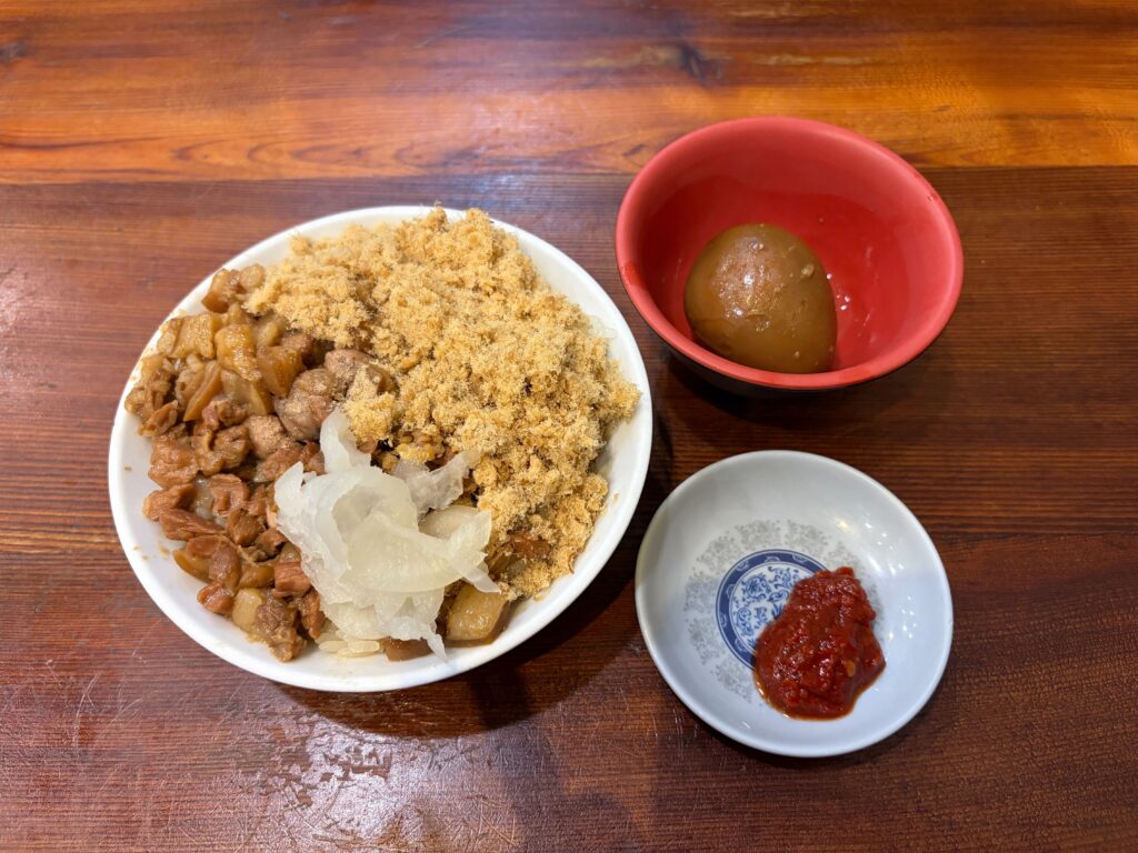 台南の米糕は甘く煮込んだ豚バラ、魚鬆(でんぶ)がトッピングされていて、もち米はプリン型等で形成はされずそのまま白米と同じようにお椀に盛られたスタイルで提供されます🍚